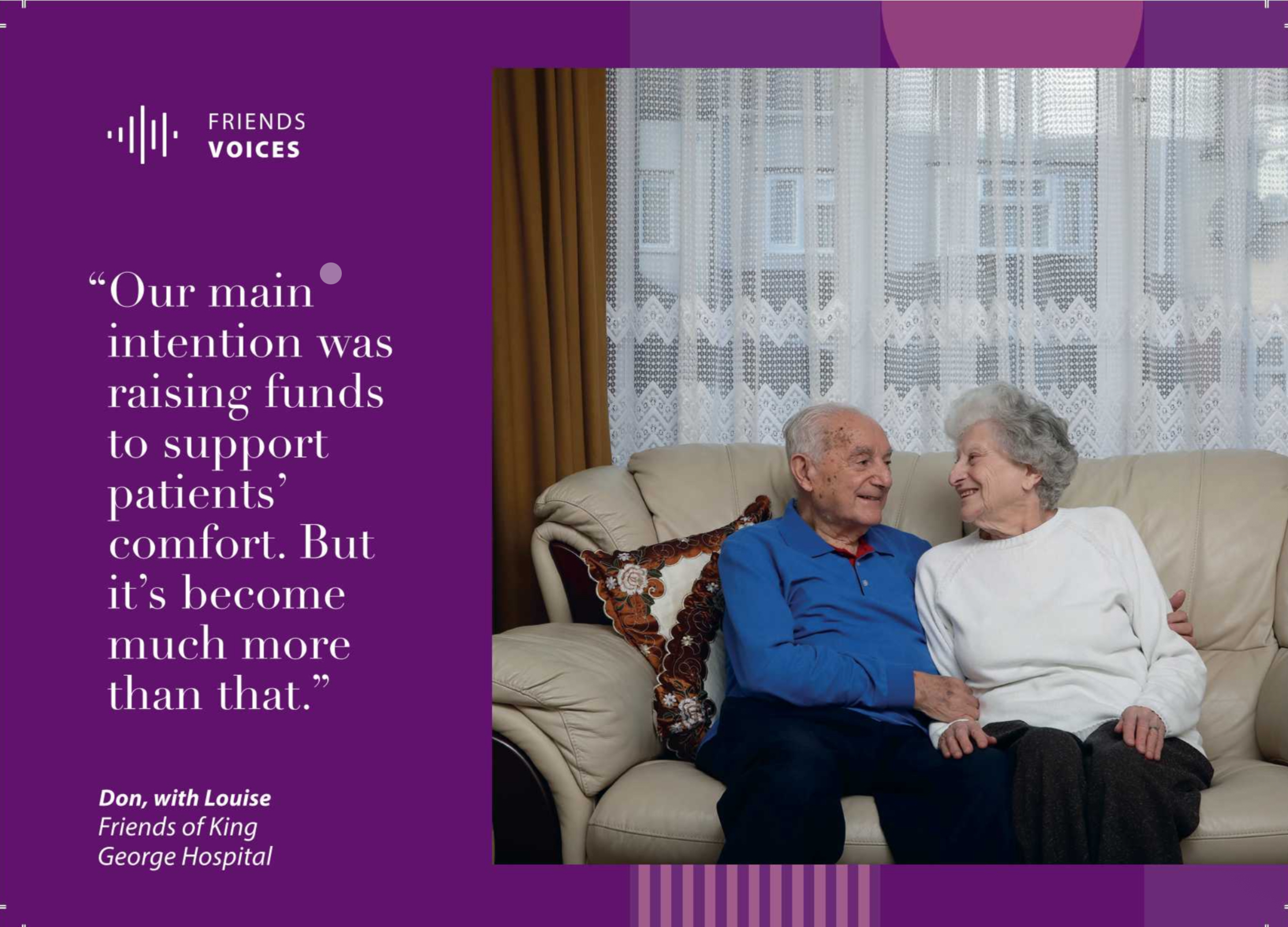 Over fifty years ago, three couples put an enormous amount of time and effort into creating and running the League of Friends of King George Hospital. Those valiant people have made way for younger people who continue to fly the flag. Sadly, of those original people, I'm sad to announce the recent passing of two of those original people, Pam Goldring, who left the league some time ago but worked for many years as shop manager, and Don Wyman, our Chairperson for many years and recent President. We pass our deepest condolences on to their nearest and dearest.